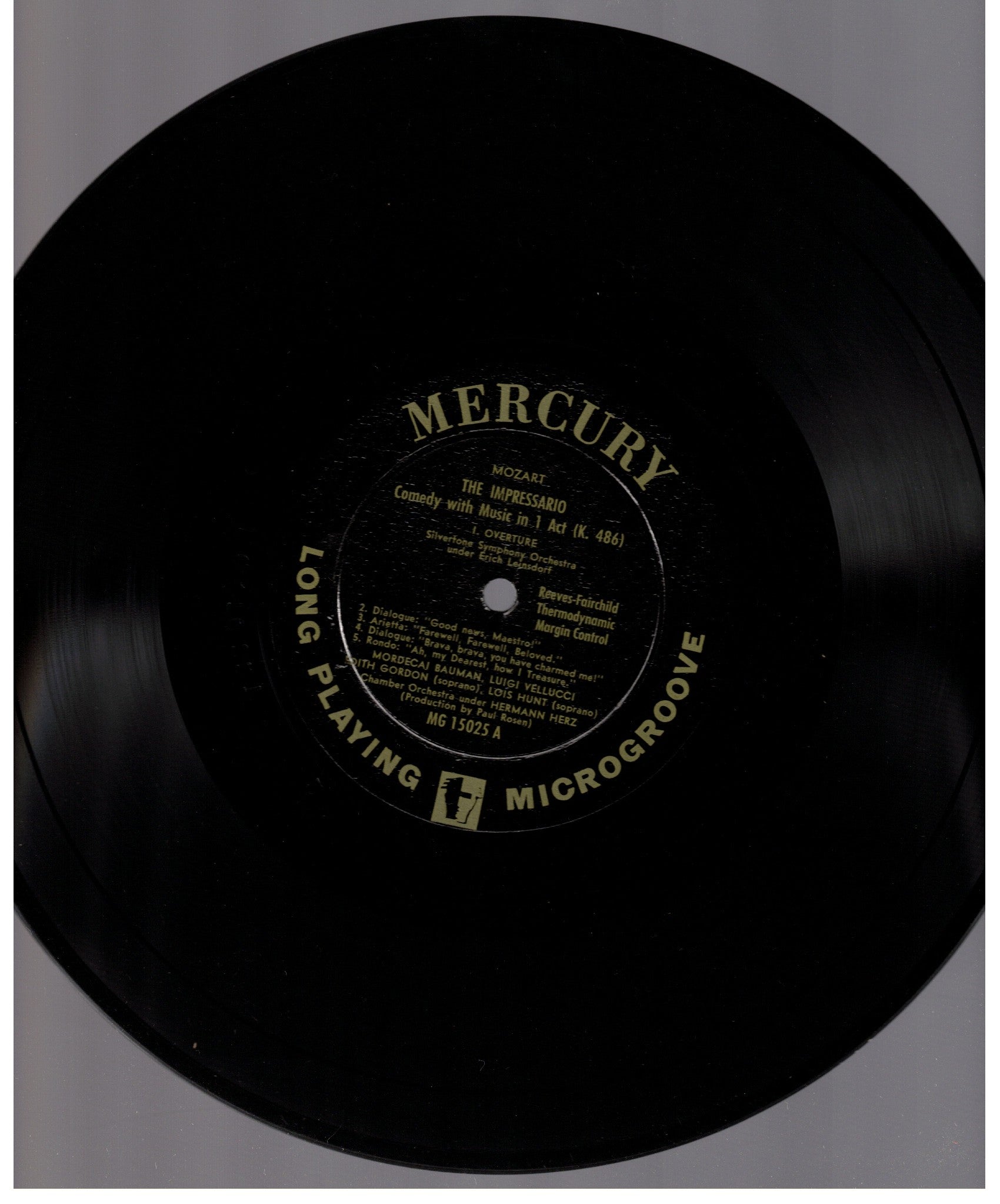 Experience this rare Mozart opera recording of The Impresario released in 1950 by Mercury featuring an exceptional ensemble of classical musicians including Edith Gordon, Lois Hunt, Luigi Vellucci, Mordecai Bauman, Hermann Herz, Paul Rosen and George Mead. This vintage classical 10" music recording (catalogue number MG 15025) showcases multiple talented artists performing Mozart's timeless compositions in authentic period style.